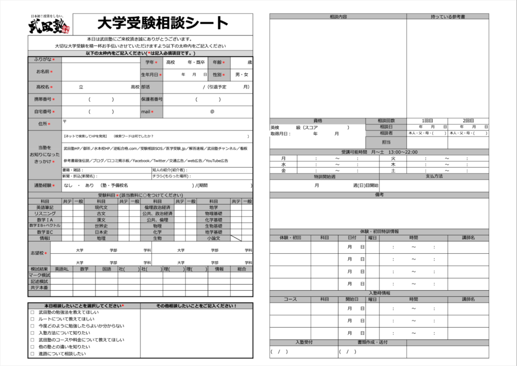 こちらが実際に記入していただく大学受験相談シートです。