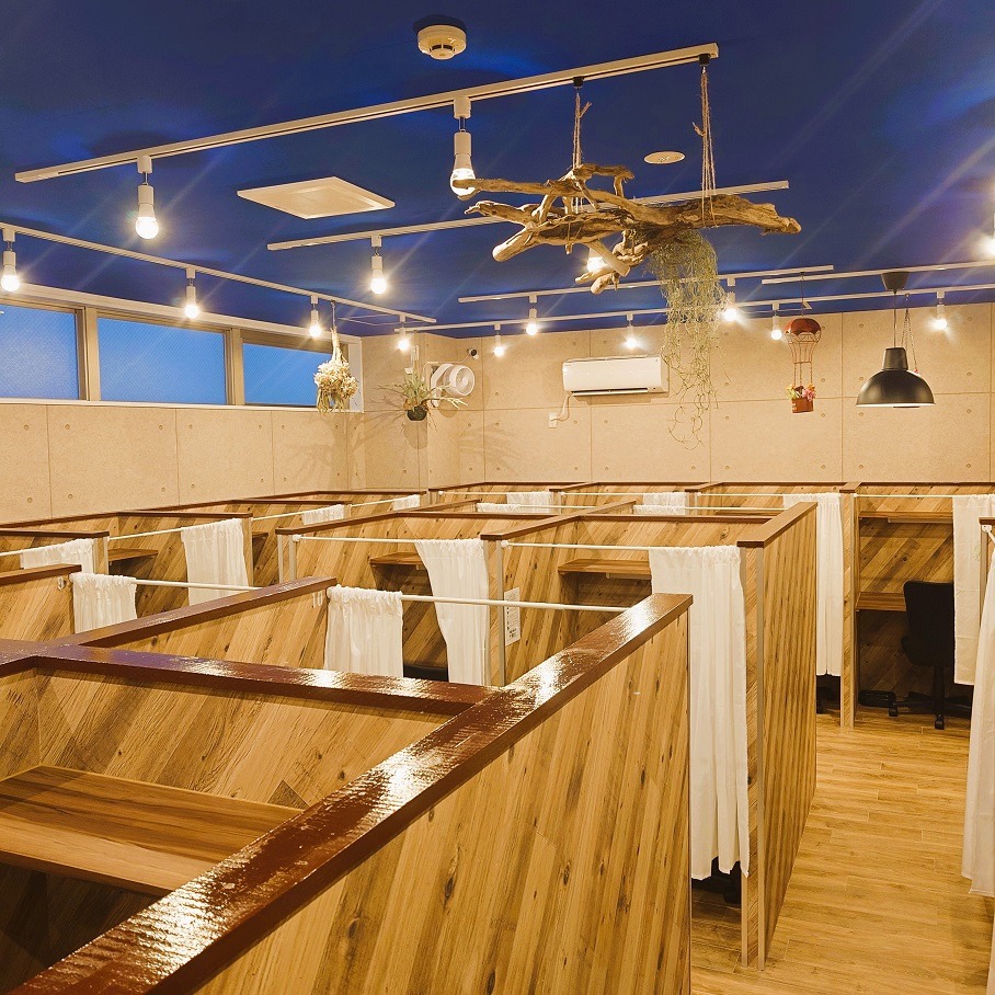 全席はオーダーメイドの木製机とカーテン付きの半個室仕様で、周囲を気にせず集中して学習や仕事ができる環境が整っています。また、Wi-Fiや電源も完備されています。